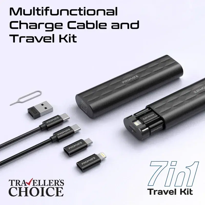 PERK by Promate is the ultimate travel companion for tech-savvy adventurers and busy professionals alike. This sleek, compact rectangular pusher case is a convenient all-in-one solution for your smartphone on the go, housing a powerful, 60W fast charge and sync USB-C cable, alongside versatile adapters for Micro-USB, Lightning and USB-A connections. PERK also features TF card slots, Micro and Nano SIM card slots, and a handy SIM card pin, ensuring you're prepared for any digital task on the go. Lightweight and easy to carry, PERK seamlessly blends style and functionality, making it the must-have gadget for efficient and hassle-free travel. Empower your journey with PERK and stay connected, wherever you are.