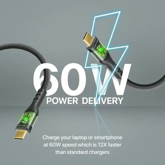 Designed to work flawlessly with any USB-C device, TransLine-CC is the ultimate cable with a uniquely stylish design. Charge your laptop or smartphone at 60W speed which is 12X faster than standard charging cables. Engineered with a tough nylon braided exterior to resist damage from the outside and reinforced transparent Shells with LED lights, this cable offers higher durability and unrivaled charging. Designed for flawless use with a wide range of devices, TransLine-CC offers data transfer of 480Mbps. Experience unique ultra-fast charging with TransLine-CC.