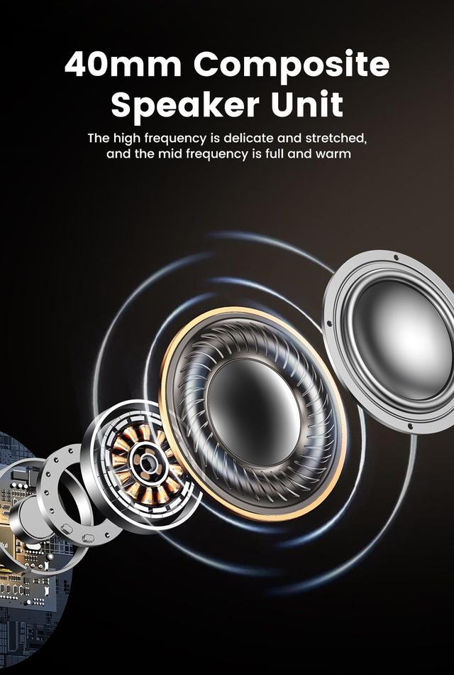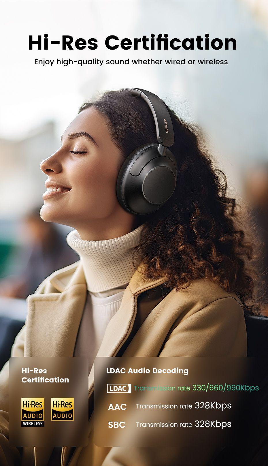 【High-Resolution, Lossless Sound】Hi-Res certified (both wired and wireless versions), the UGREEN Hi-Tone Maxx 5 Bluetooth headphones reproduce the subtle details only heard in a recording studio, with a frequency response of up to 40kHz. HDC encoding delivers high-resolution audio streaming with low latency, while an advanced AI algorithm enhances bass, providing audiophile-grade sound quality.