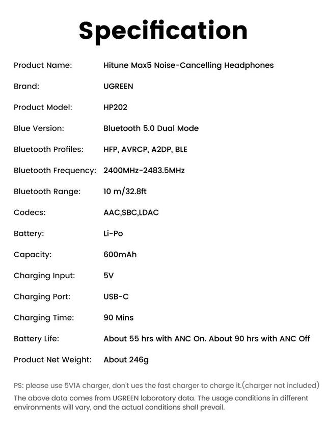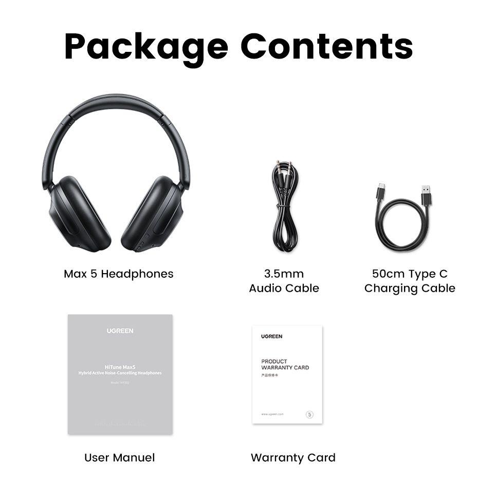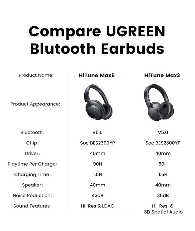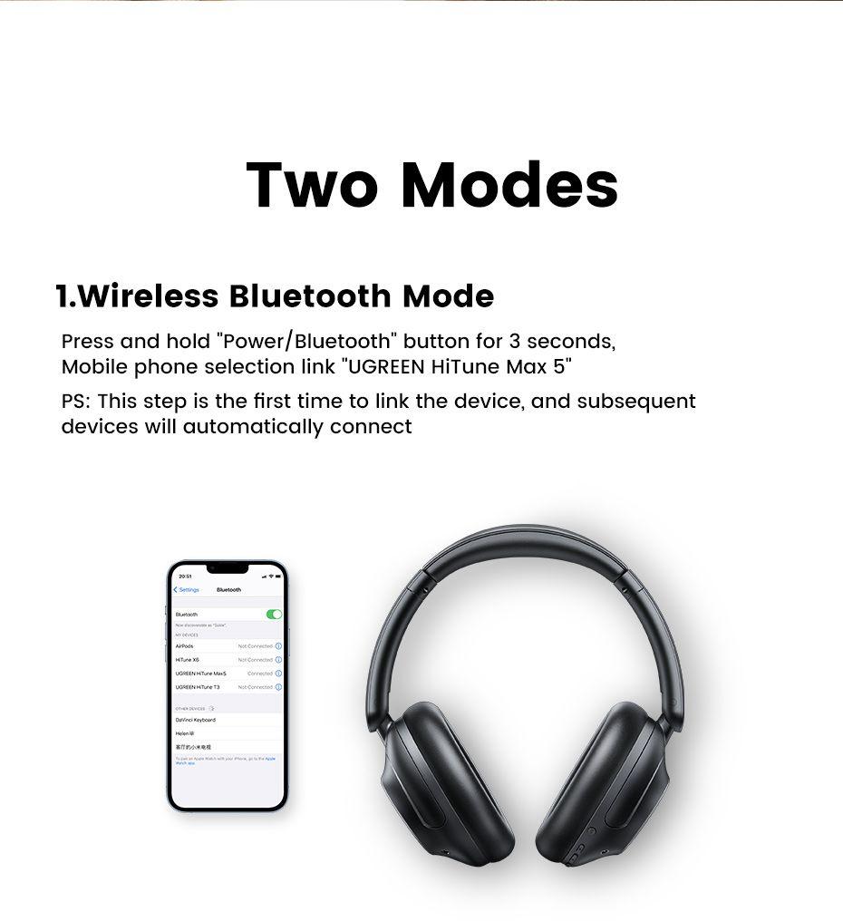 【Up to 90 Hours of Playtime, Fast Charging】The UGREEN wireless headphones provide up to 90 hours of playtime on a single charge. A quick 5-minute charge gives you up to 9 hours of playtime. These wireless headphones can also be easily connected to other non-Bluetooth devices via a 3.5mm audio cable. Simply plug in the included audio cable for extended wired listening.