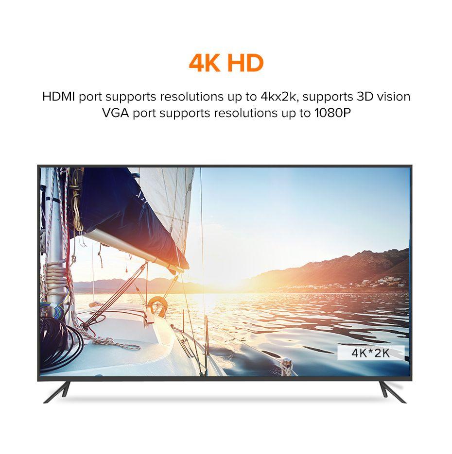 The HDMI port supports high-resolution displays up to 4K for a crystal-clear viewing or presentation experience, while the VGA port delivers excellent 1080p resolution for traditional monitors.