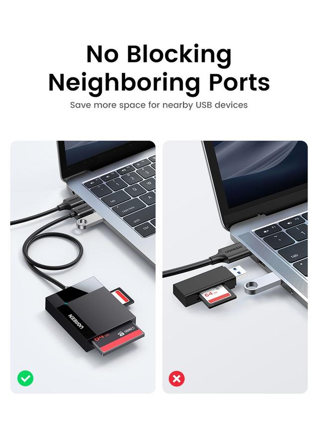 The reader features four independent slots supporting SD, Micro SD (TF), CF, and MS cards, enabling you to read all your cards in one device without the need for additional adapters.