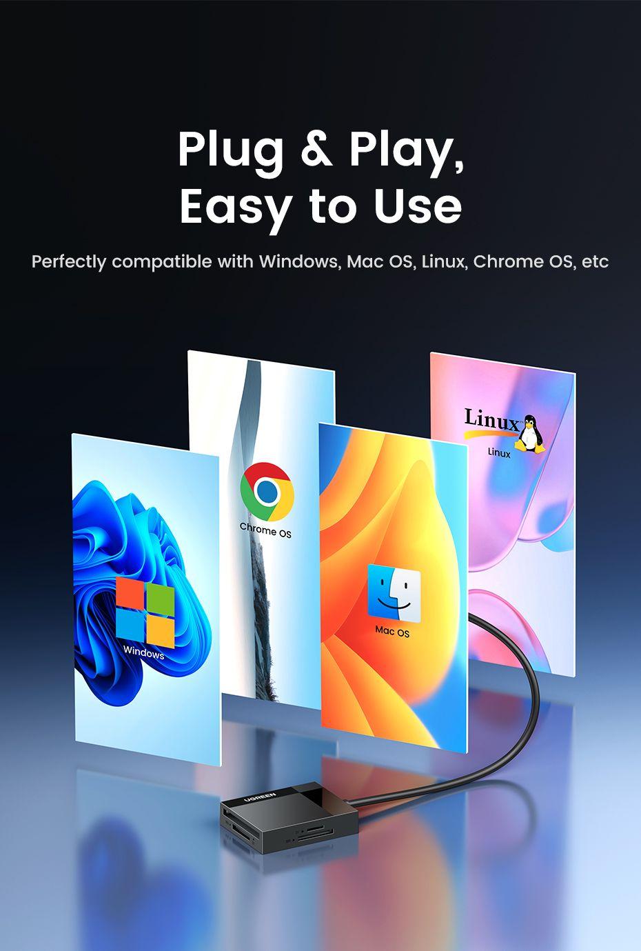 The reader operates with Plug & Play technology, requiring no additional drivers, and is compatible with Windows XP/Vista/7/8/8.1/10, Mac OS, and Linux.