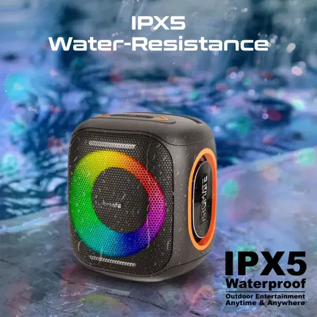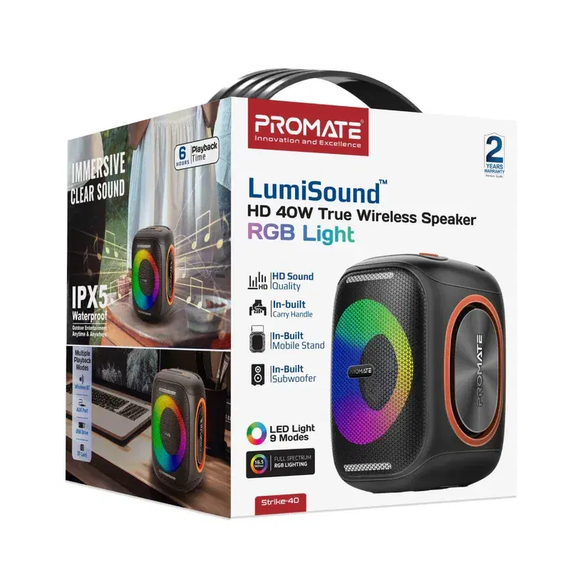 Experience sound that moves you with the Promate Strike-40, where bold design meets breathtaking performance. Feel every beat with 40W of high-fidelity audio, backed by a 6000mAh battery that keeps the music going for up to 6 hours. Transform any moment with 9 dazzling RGB light modes, all while your device stays secure in the built-in phone stand. Strike-40’s 4 different audio modes ensure instant access to your favorite tracks, and its silicone cover shields against splashes and spills. With IPX5 water resistance, this speaker isn’t just ready for the party—it’s ready for the adventure.