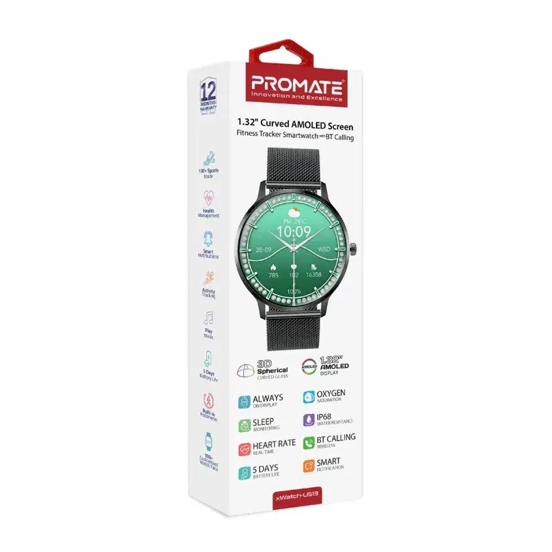Elevate your style and functionality with xWatch-US13 by Promate, a sleek and ultra-thin smartwatch designed for the modern lifestyle. Stay connected with Bluetooth calling, manage your fitness with over 100 sports modes, and track your active life effortlessly. Its stunning 1.32-inch AMOLED display with 3D spherical curved glass delivers vibrant visuals in 466*466 resolution, blending elegance with cutting-edge clarity. Crafted with a durable metal case and IP68 water resistance, this smartwatch is built to withstand both splashes and sweat. With a 200mAh battery ensuring long-lasting performance, xWatch-US13 is the perfect companion for every moment of your day.
