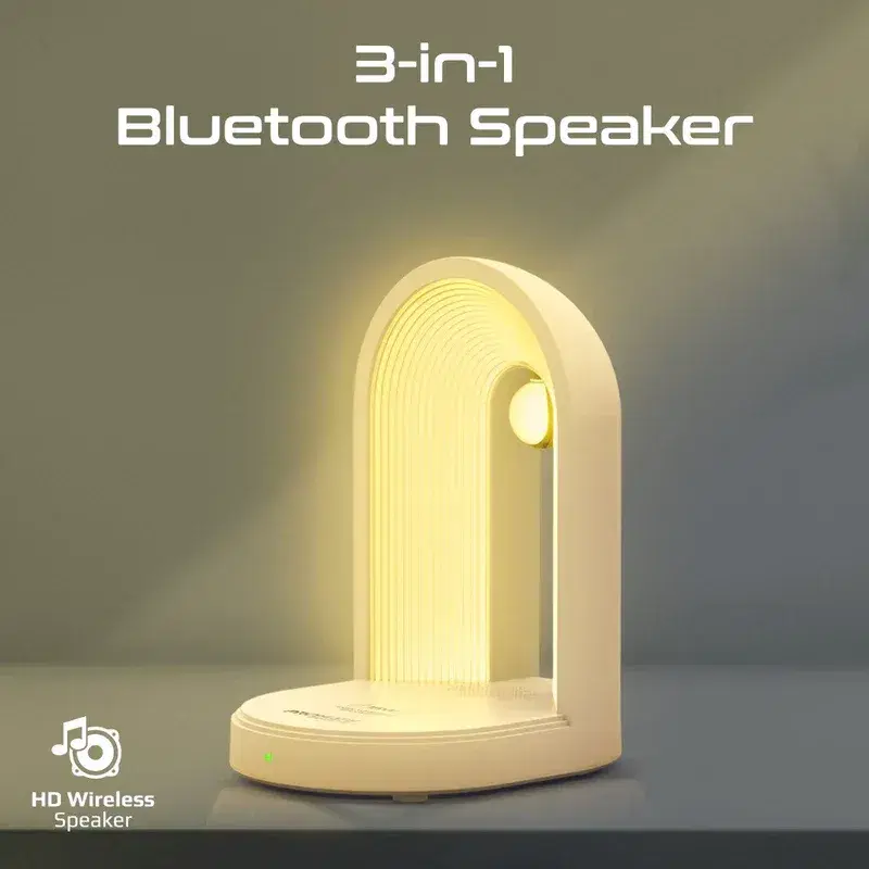 3‑in‑1 functionality: LED lamp, Bluetooth speaker, and 15 W wireless charger.