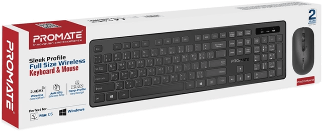 Promate Wireless Keyboard and Mouse Combo Pro Combo13, 2.4Ghz Full Slim Keyboard, 1600 DPI Ambidextrous Mouse, USB Nano Receiver, Quiet Keys, Angled Stand for iMac, MacBook
