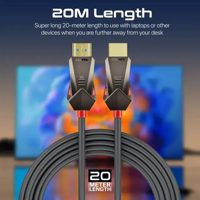 Enhance your viewing experience from the comfort of your living room with ProLink4K60-20M. Supporting resolutions up to 4K@60Hz, this unidirectional HDMI® cable provides crisp vibrant video quality without any lag or drop-off. The gold connectors deliver optimal signal transfer with lower distortion, while the 20-meter optical fiber cable allows signal transmissions over long distances without any degradation. The ethernet function on this HDMI® cable ensures you can share your Internet connection with multiple devices. Unlock a new and amazing visual experience with ease.