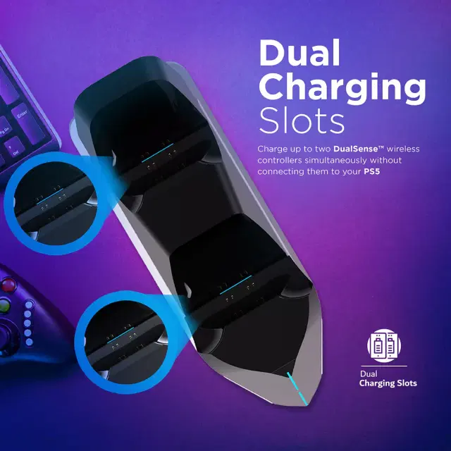 Dual Charging: Charges two PS5 DualSense controllers simultaneously.