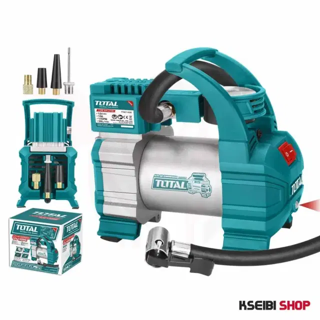 The Total Tools 12V 1-piston air compressor is an indispensable tool primarily for car owners, although with its help you can inflate not only car tires but also, for example, inflatable boats. This device is powered by a 12V electrical network with a rated current consumption of 10 amps. At the same time, the compressor generates a maximum working pressure of 10 bar, ensuring 15 minutes of continuous operation. Power is supplied via a 3-meter cable with a small battery and a 1.5-meter dust hose, as well as a high-precision and reliable pressure gauge, a front light, a 1-pin clamp and 4 nozzles.
