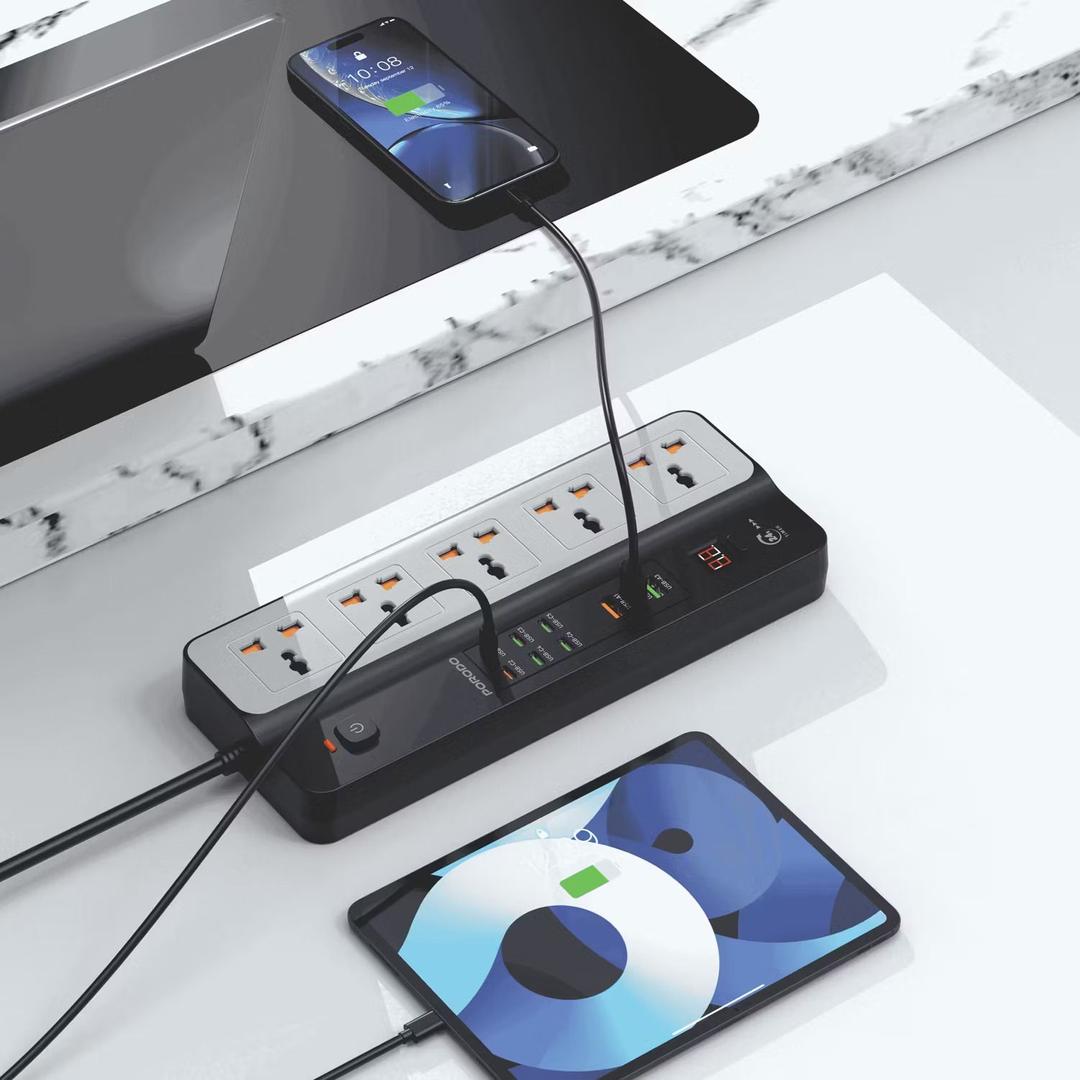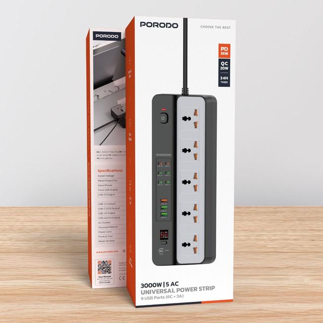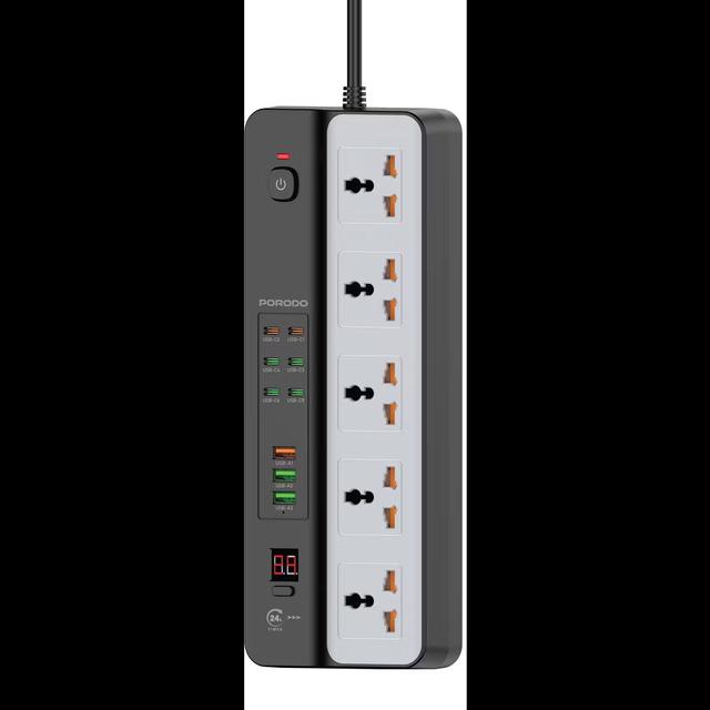 Porodo PDFWCH098BK 3000W | 5AC Universal Power Strip with 9 USB Ports (6C + 3A)
