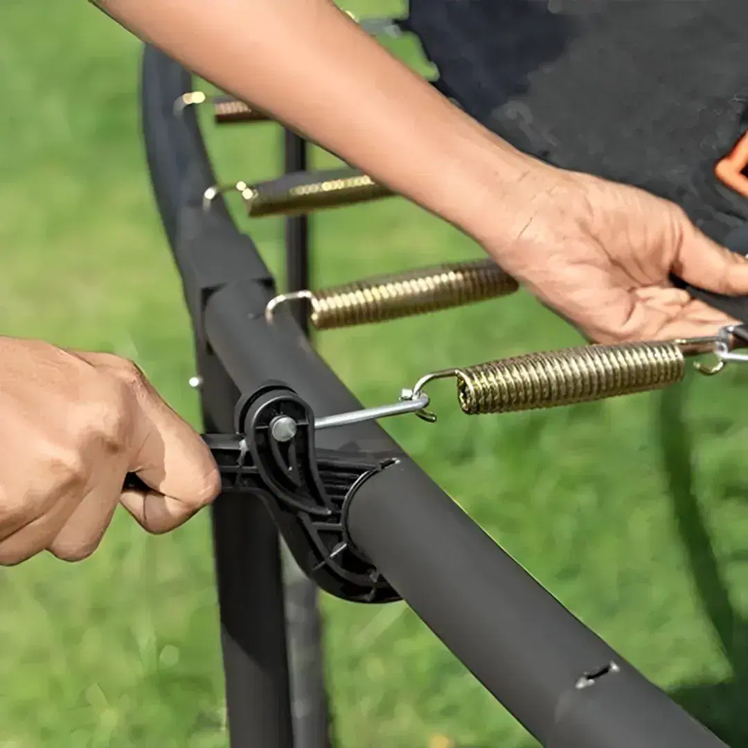 EASY SET-UP The Xtreme Air trampoline has all you need for a complete trampoline, including an easy assembly kit that includes Bestway’s patent-pending QuickSpring trampoline tool for hassle-free spring installation with a dual action wrench handle, plus spring-pin and bolt connections on the enclosure poles for simple setup.