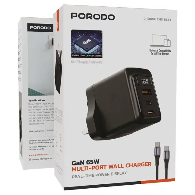 Experience the ultimate speed charging with Porodo GaN 65W Multi-Port Wall Charger. By being speedy, it is on par with multi-conversion chargers and is great for power compatibility. Being an advanced GaN technology charger, it can put out 65W, enough to charge all kinds of laptops, tablets, and smartphones simultaneously. Two USB-C ports and a USB-A port equip the charger to be compatible with a range of charging protocols that include PD 3.0, PPS, QC 2.0–4.0+, Apple, FCP, SCP, Samsung, DCP, AFC, VOOC, and PE+, thus making it compatible with almost every modern device. Depending on whether you are powering your MacBook, iPhone, Samsung Galaxy, or any other USB-powered device, the Porodo charger will adapt and fairly distribute power at the right level for that device. Some multi-device charging programs of 45W + 20W or 45W + 18W allow you to fast charge your laptop and charge your phone at the same time. It features a real-time power display, wide voltage input of 100-240V, and safe operation from 0° - 40°C.