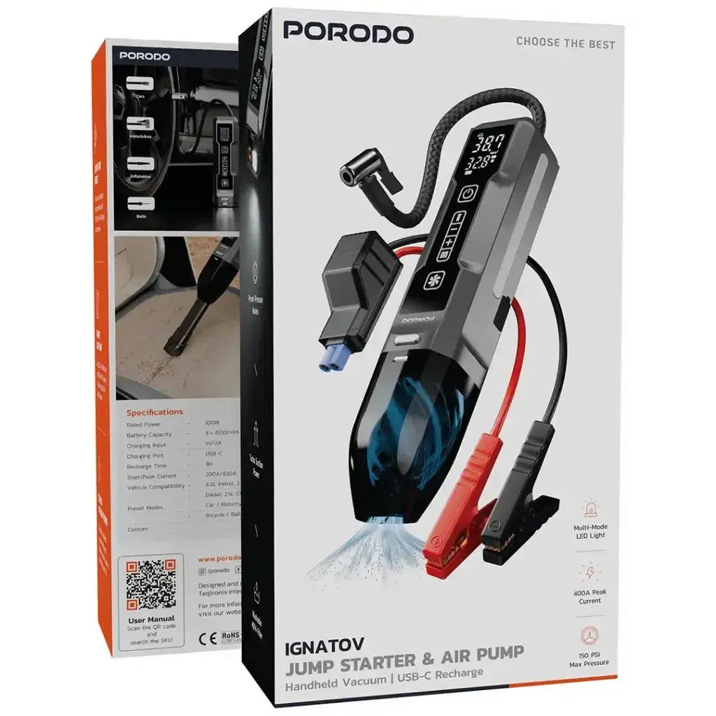 Porodo Ignatov Jump Starter & Air Pump with Handheld Vacuum & USB-C Recharge - PDJS41BK