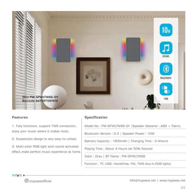Pawa PW-SPWLTW66 Wall-Mounted Wireless Speaker with RGB Lighting