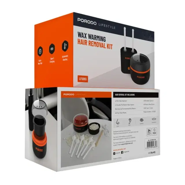 Porodo Lifestyle Wax Warming Hair Removal Kit is a useful kit for your home that allows you to remove unwanted hair from your body, achieving a smooth and hair-free skin finish. It is a complete kit that includes a mini wax warmer, double pot nostril wax heater, and 50 g specially formulated hair removal wax beans. The kit includes five post-wax wipes, six wooden spatulas, six plastic wax sticks, and a USB Type-C charging cable. The waxing kit offers easy and fast waxing sessions, as it quickly melts the wax and has automatic heating and Type-C charging. This fully equipped hair removal kit lets Users get salon-style results at home.