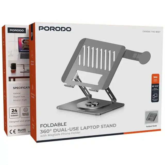 The Porodo Foldable 360° Dual-Use Laptop Stand with MagSafe Phone Holder - Gray is designed for a variety of purposes, providing the user with comfort and an easy-to-carry experience. It allows a complete customization of the viewing experience of laptops and smartphones through its 360° rotation and multi-angle adjustment. The stand is capable of holding up to 5 kg and has a strong, anti-slip base for its stability. Its ergonomic design guarantees comfort for the users throughout the day or wherever they might be-- home, office, or traveling. The MagSafe phone holder makes sure that your phone is in a spot that you can't miss and in a position that is easy to use along with your laptop. The folding design makes this stand not only compact but also easy to store; hence, it is the perfect travel companion. It is compatible with a wide range of devices, from laptops with a screen size of 10” to 17.3'' and mobile phones that are 4" to 7'' in size.